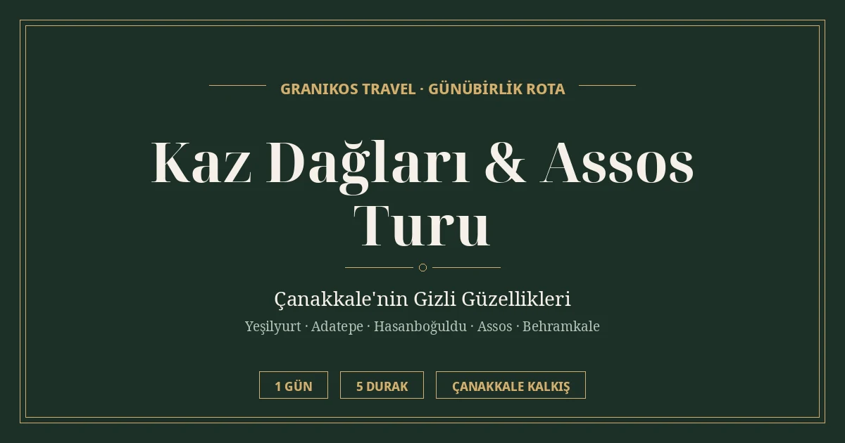 Ege'nin mistik güzelliklerine, Kaz Dağları'nın tertemiz havasına ve Assos'un binlerce yıllık tarihine tanıklık etmek için bir günlüğüne de olsa şehir hayatının koşturmacasından uzaklaşın. Granikos Travel olarak, bu eşsiz coğrafyanın tüm sırlarını sizinle paylaşmak için sabırsızlanıyoruz. Yeşilyurt'un taş evlerinden Athena Tapınağı'ndaki gün batımına, Hasanboğuldu'nun efsanesinden Adatepe'nin zeytinyağı kokan sokaklarına kadar her anı keyif ve keşifle dolu bir Kaz Dağları Assos turu sizi bekliyor. Hadi, doğanın kalbinde buluşalım ve birlikte unutulmaz bir yolculuğa çıkalım. Hemen rezervasyonunuzu yapın ve bu maceraya katılın!